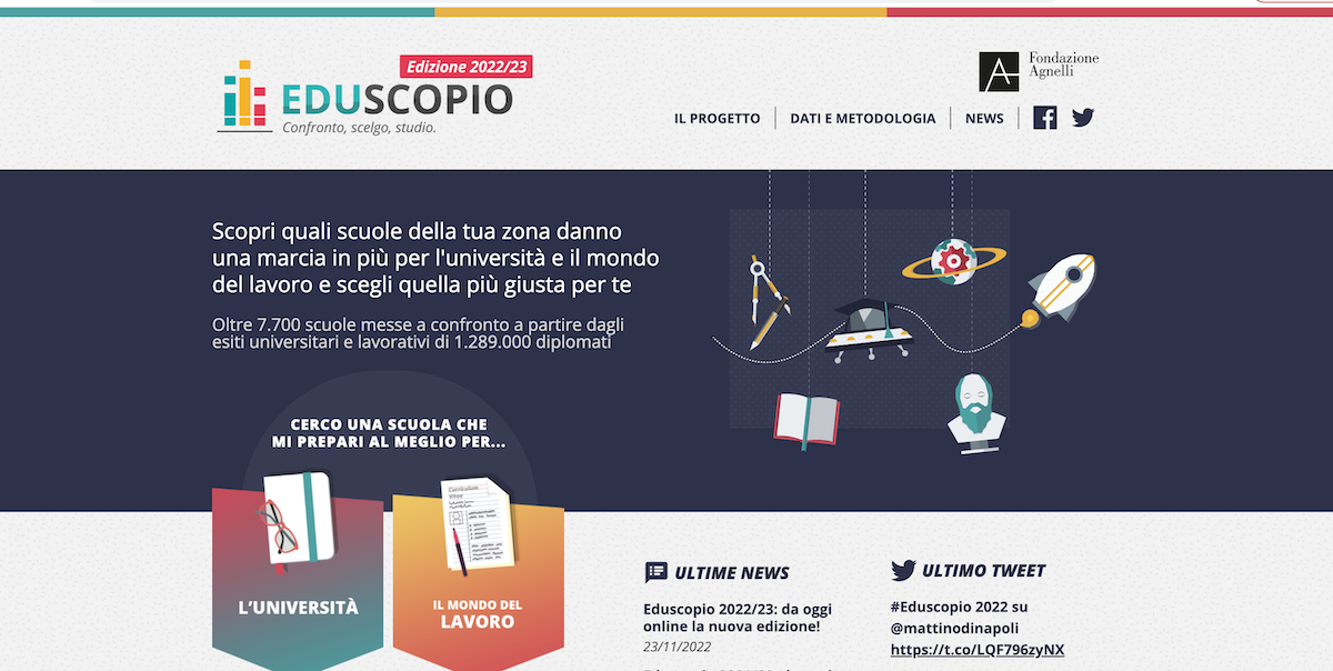 È online da oggi l'edizione 2022/23 dell'indagine Eduscopio della Fondazione Agnelli, con i dati aggiornati sulle scuole superiori che meglio preparano agli studi universitari o al lavoro dopo il diploma.